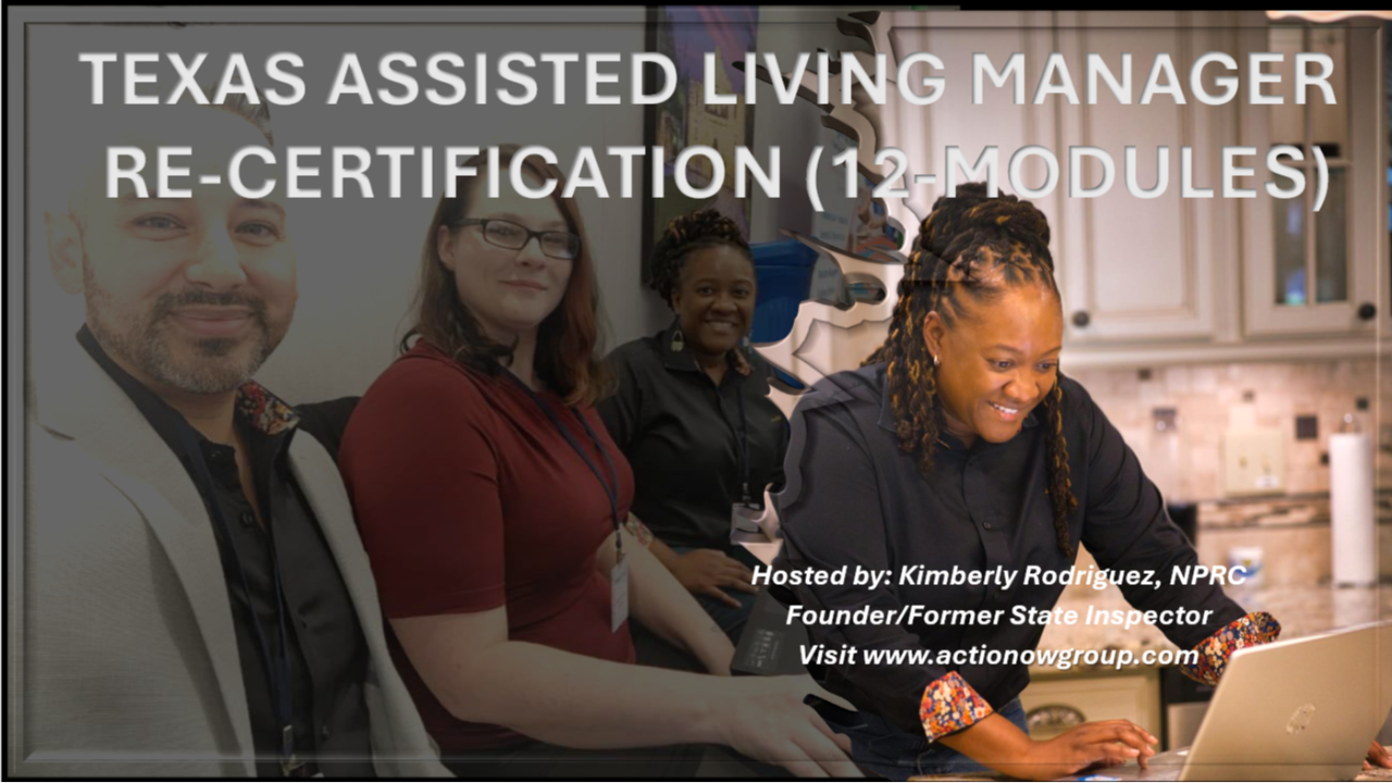 Action Over Words Group LLC presents the Texas Approved 12‑Hour Assisted Living Manager Recertification Course — ideal for certified ALF Managers needing their annual training in compliance with 26 TAC §553.253.